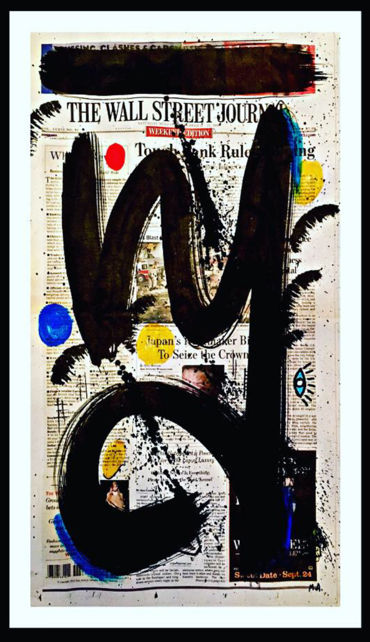 Mixed media on newspaper paper (The Wall Street Journal).